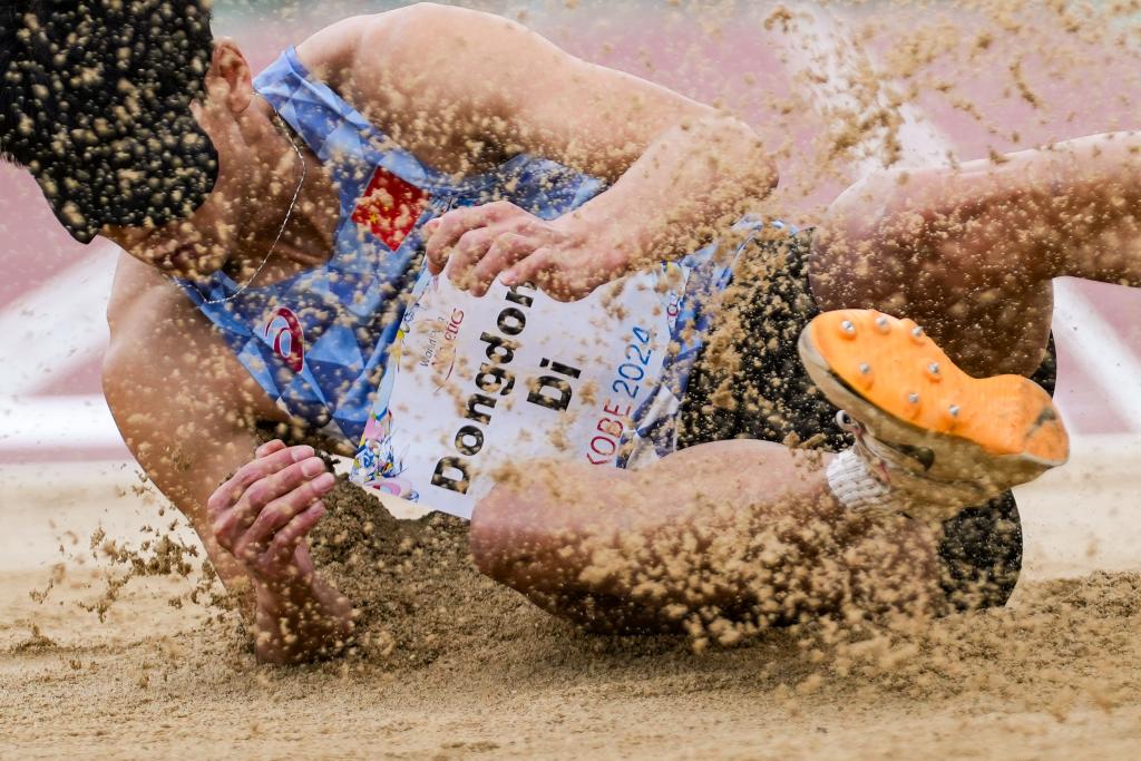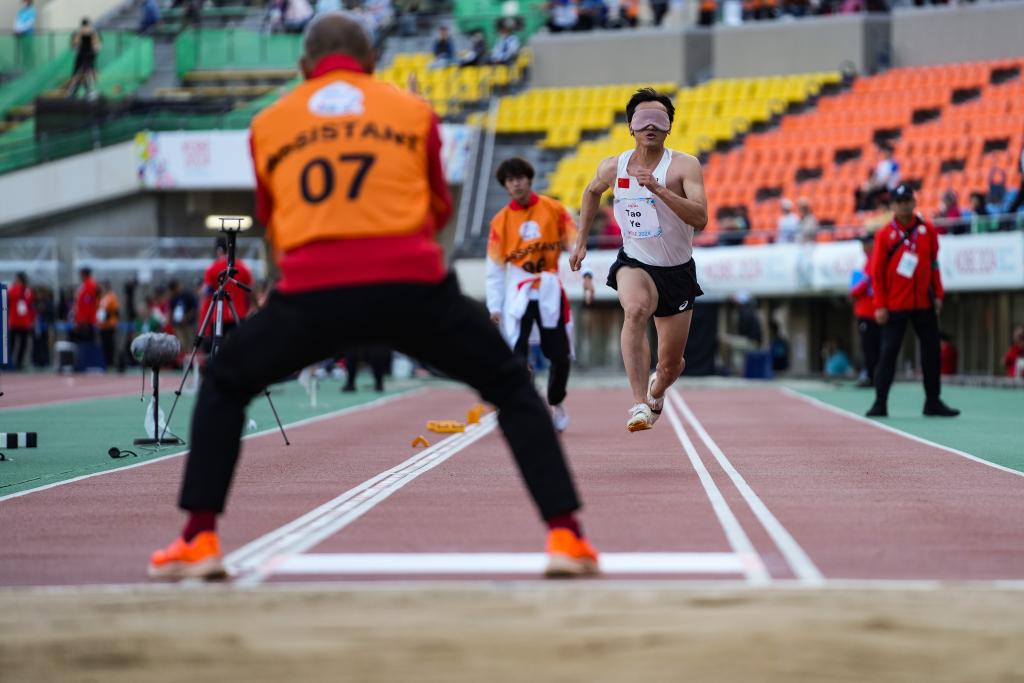 5月17日,中国选手邸东东在男子跳远T11级决赛中试跳。最终,他以6米50的成绩获得亚军。