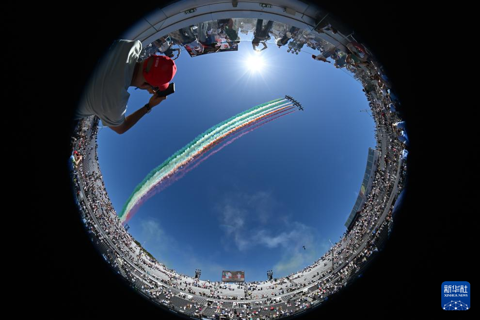 5月17日,意大利“三色箭”飞行表演队飞过罗马大师赛比赛场地上空。