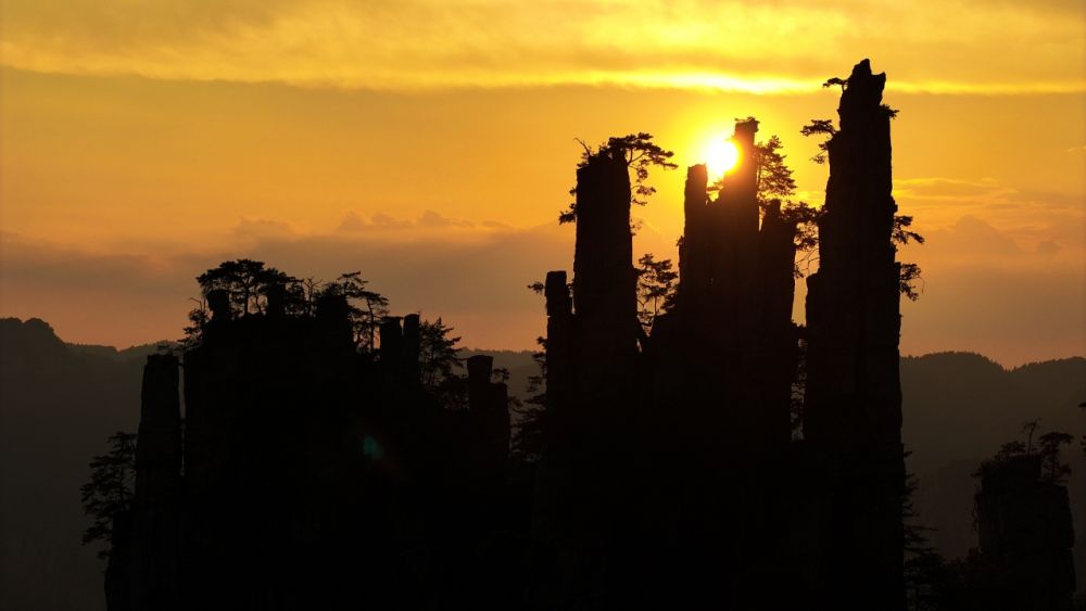 ↑夕阳下的张家界国家森林公园天子山御笔峰(2023年9月10日摄)。