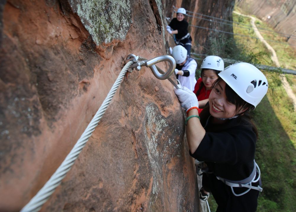 ↑游客在张家界市慈利县红岩岭户外拓展运动欢乐园体验飞拉达攀岩游览项目(2018年11月28日摄)。