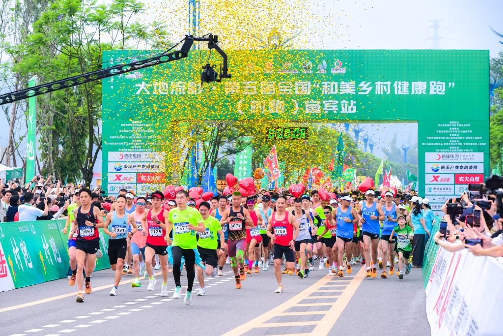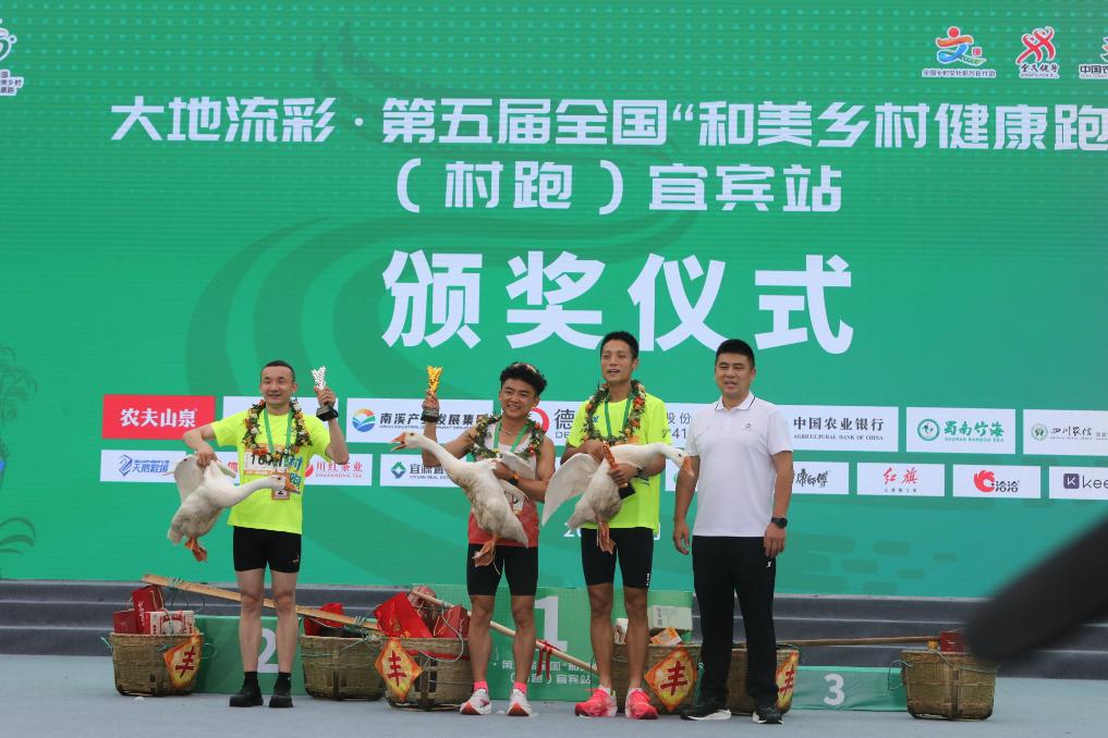 这是大地流彩·第五届全国“和美乡村健康跑”(村跑)宜宾站颁奖的现场。来自全国各地的3000余名跑步爱好者在长江边尽享绿水青山,获得各组别前三名的选手们均领到了他们的奖品——两箩筐的当地特产以及一只活蹦乱跳的大鹅。