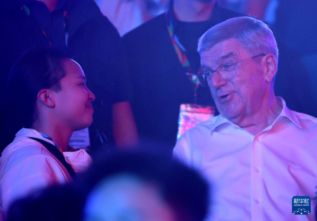 5月19日,国际奥委会主席巴赫(右)与中国霹雳舞选手刘清漪在场边交流。新华社记者 贾浩成 摄