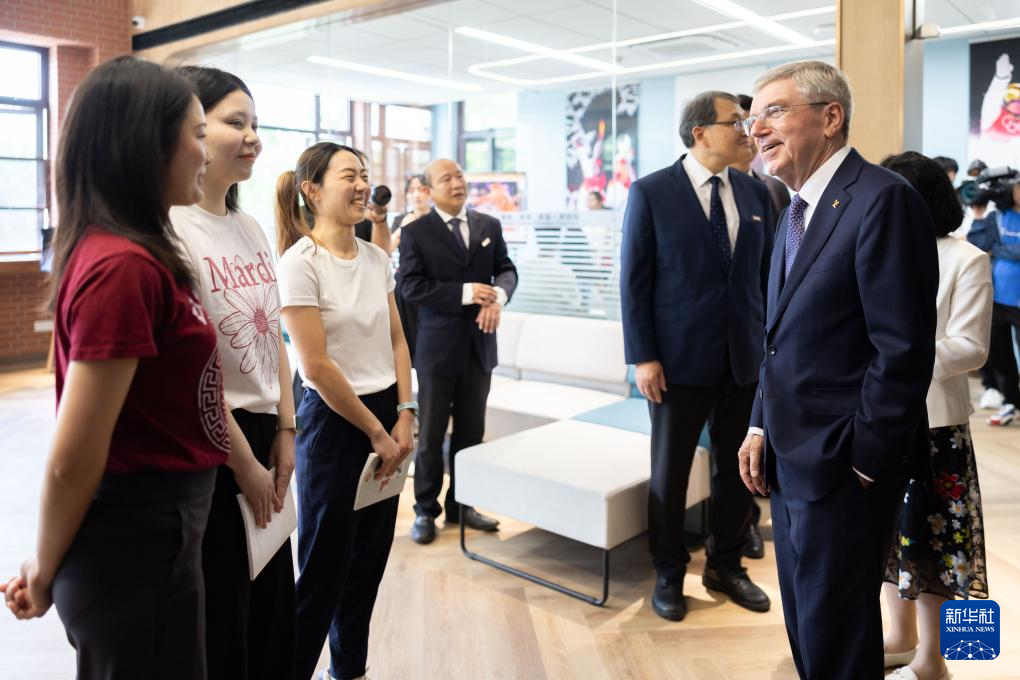 5月19日,国际奥委会主席巴赫(前右)在上海体育大学奥林匹克研究院与学生交谈。新华社记者 王翔 摄