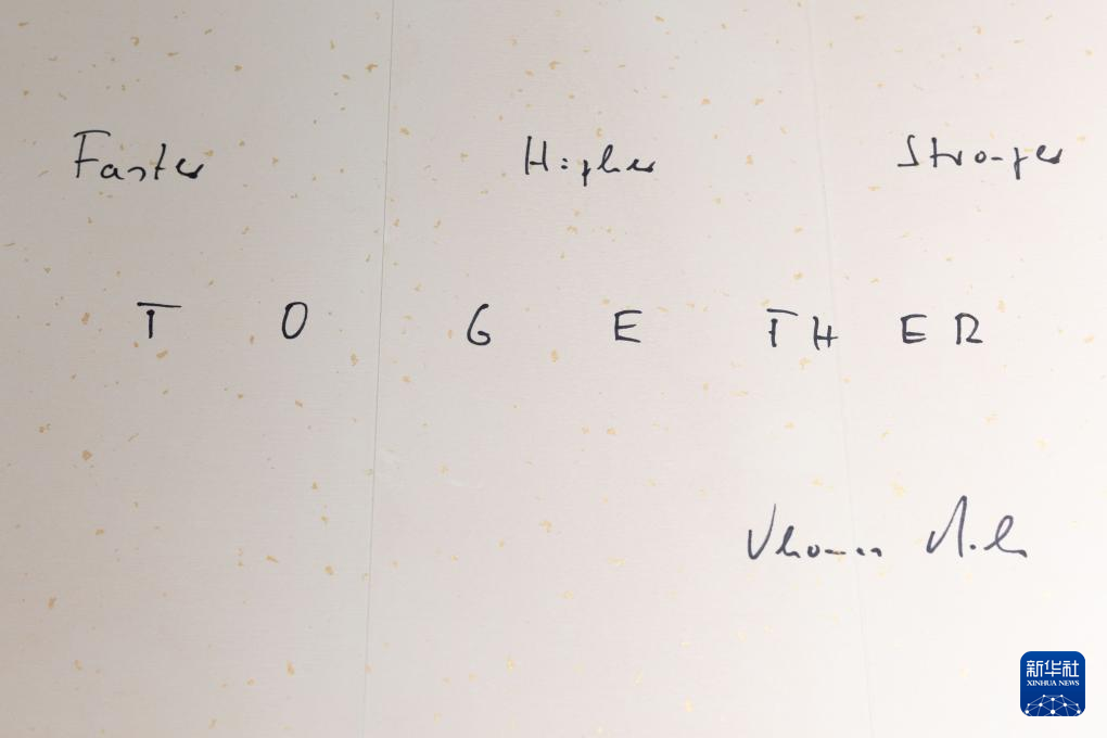这是5月19日拍摄的国际奥委会主席巴赫在上海体育大学写下的奥林匹克格言“更快、更高、更强——更团结”。新华社记者 王翔 摄
