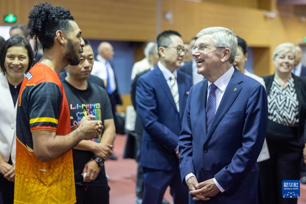 5月19日,国际奥委会主席巴赫(右)在上海体育大学中国乒乓球学院与在此集训的巴布亚新几内亚运动员罗伊交流。新华社记者 王翔 摄
