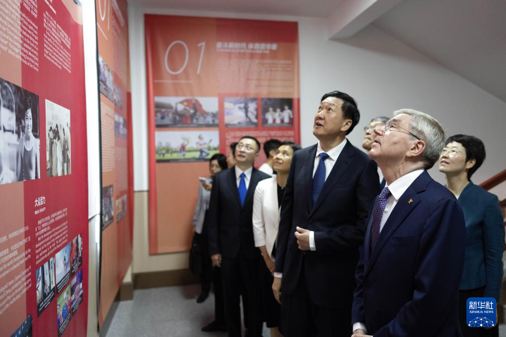 5月19日,国际奥委会主席巴赫(前)在上海体育大学观看“体育力量 中国精神”中国体育文化展。新华社记者 王翔 摄