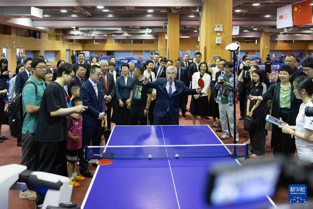 5月19日,国际奥委会主席巴赫(中)在上海体育大学中国乒乓球学院体验乒乓球机器人。新华社记者 王翔 摄