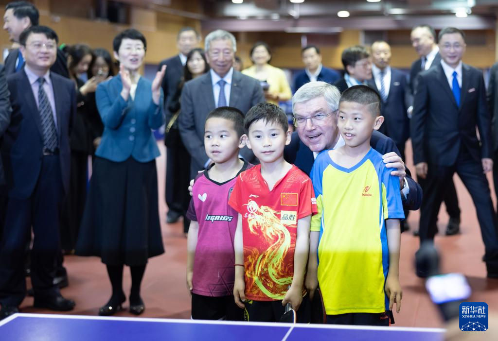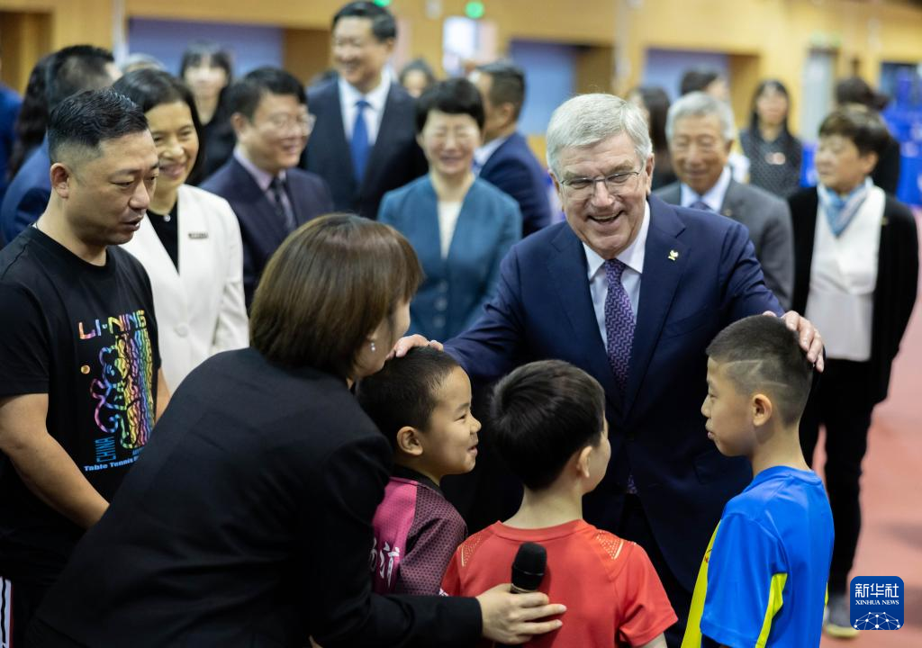 5月19日,国际奥委会主席巴赫在上海体育大学与中国乒乓球学院少年班小队员交流。新华社记者 王翔 摄
