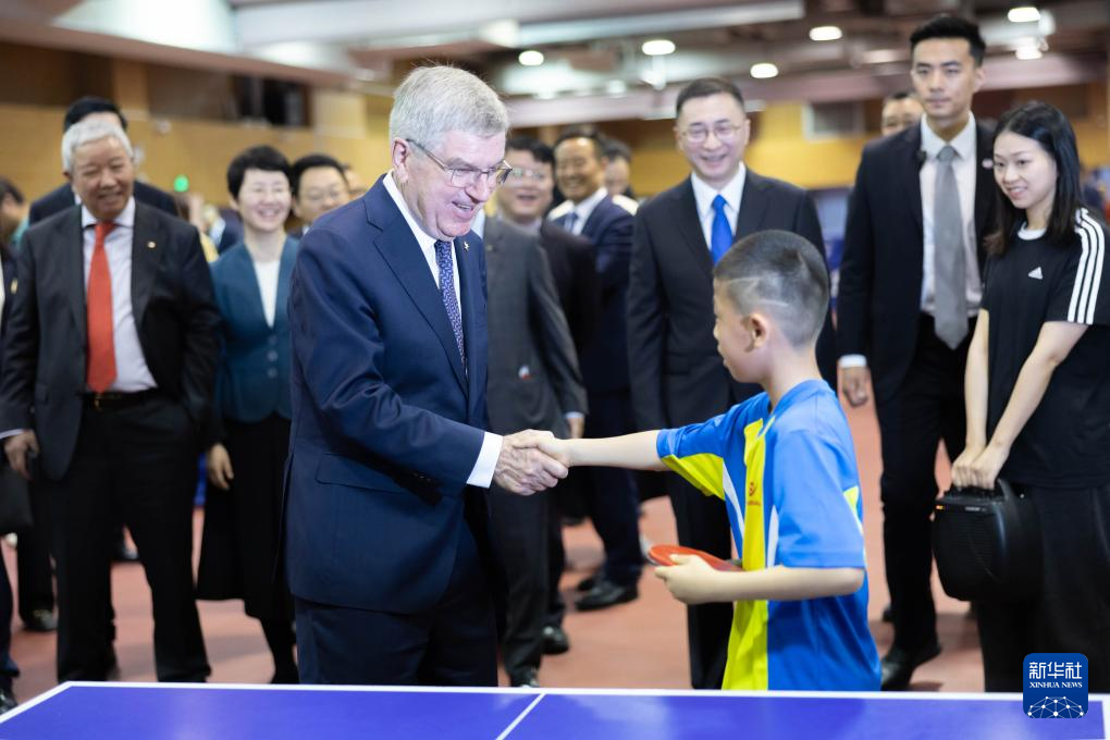 5月19日,国际奥委会主席巴赫在上海体育大学与中国乒乓球学院少年班小队员握手。新华社记者 王翔 摄