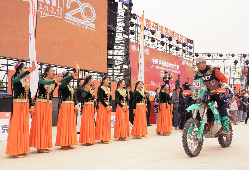 5月20日,在2024中国环塔国际拉力赛开幕式上,舞蹈演员们为MOTOREX-KTM骑士学院车队车手加油。新华社记者 张啸诚 摄