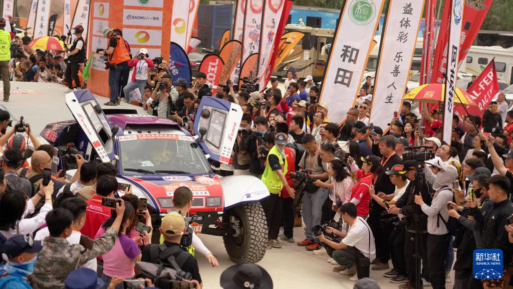 5月20日,在2024中国环塔国际拉力赛发车台前,众多媒体和赛车爱好者拍照留影。新华社记者 张啸诚 摄