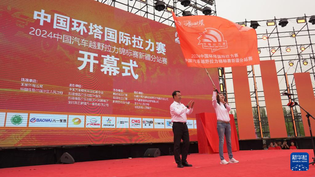 这是2024中国环塔国际拉力赛开幕式现场举行的授旗仪式(5月20日摄)。新华社记者 张啸诚 摄