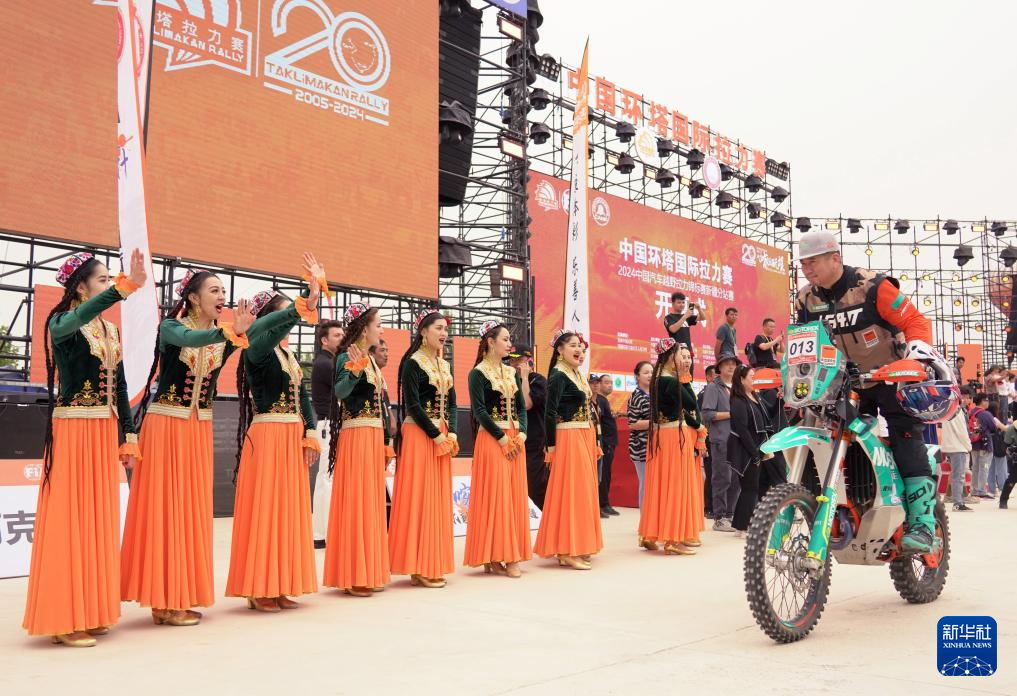 5月20日,在2024中国环塔国际拉力赛开幕式上,舞蹈演员们为MOTOREX-KTM骑士学院车队车手连欢加油。新华社记者 张啸诚 摄