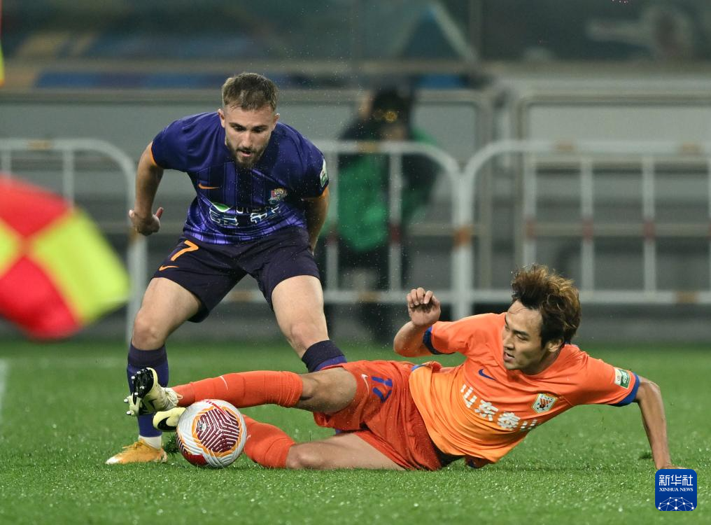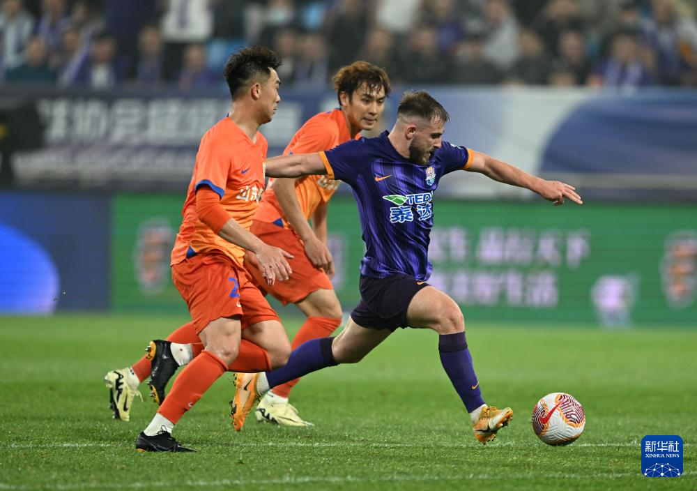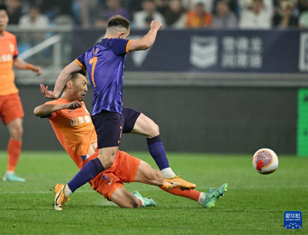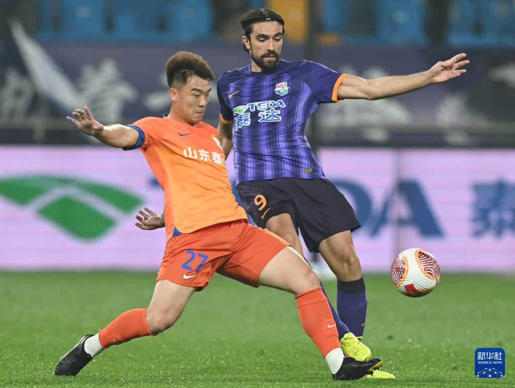 5月21日,山东泰山队球员吴兴涵(右)在比赛中防守天津津门虎队球员阿代米。新华社记者 赵子硕 摄