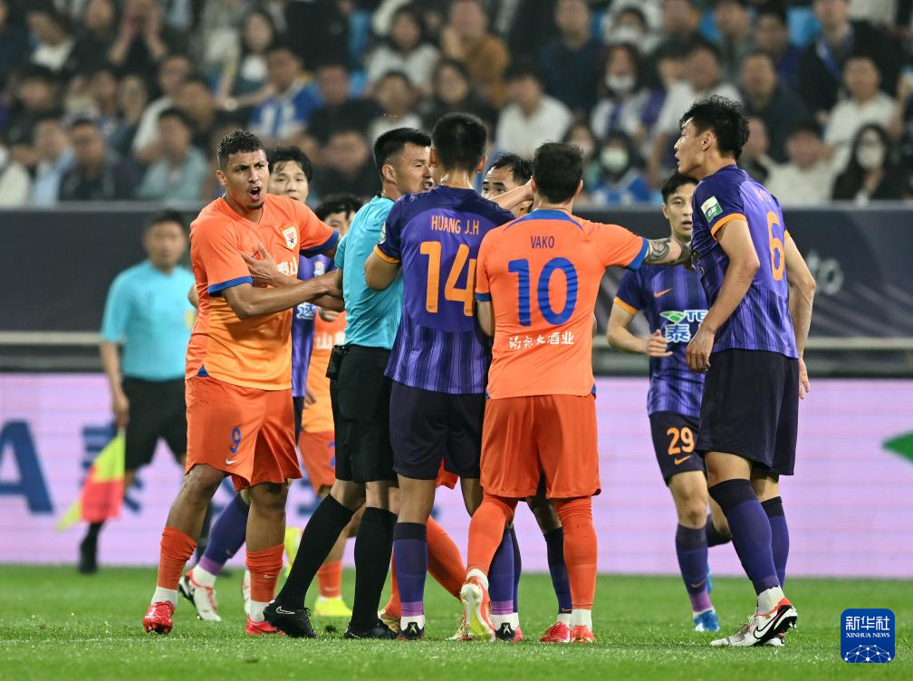5月21日,山东泰山队球员克雷桑(左一)和天津津门虎队球员韩鹏飞(右一)在比赛中争执。新华社记者 赵子硕 摄