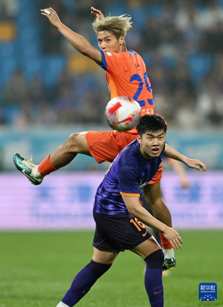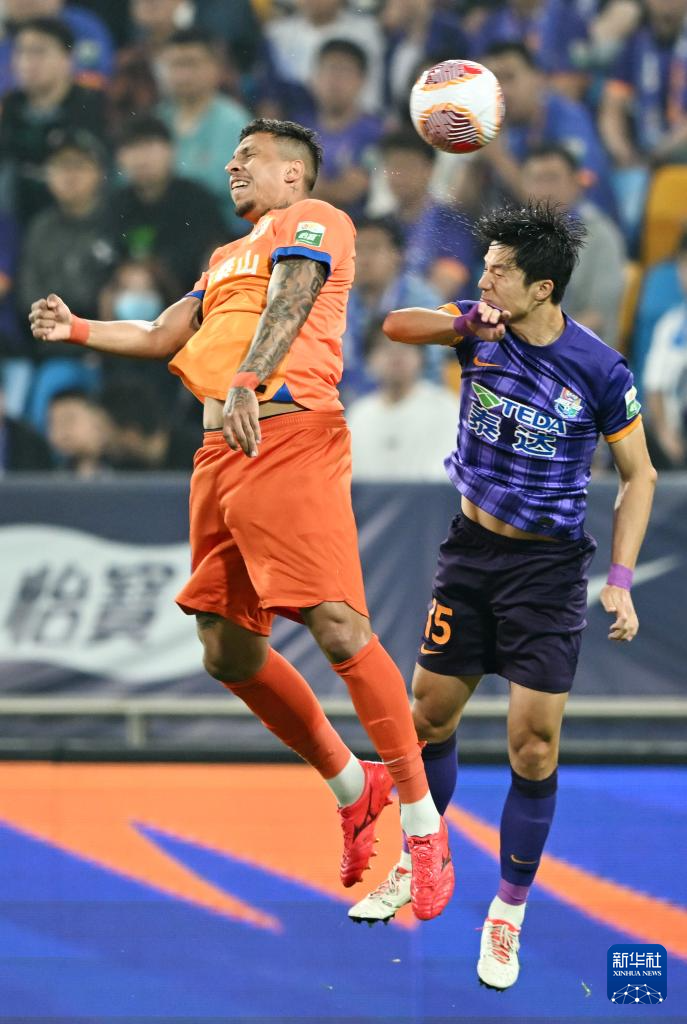 5月21日,天津津门虎队球员明天(右)和山东泰山队球员克雷桑在比赛中争顶。新华社记者 赵子硕 摄