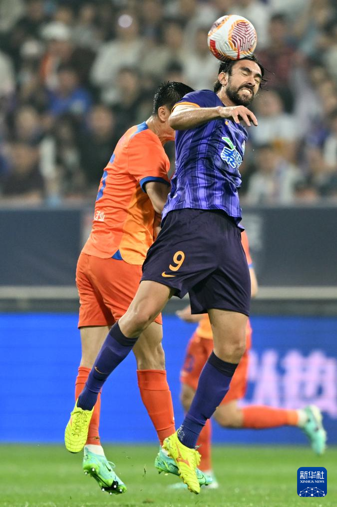 5月21日,天津津门虎队球员孔帕尼奥(右)在比赛中争顶。新华社记者 赵子硕 摄