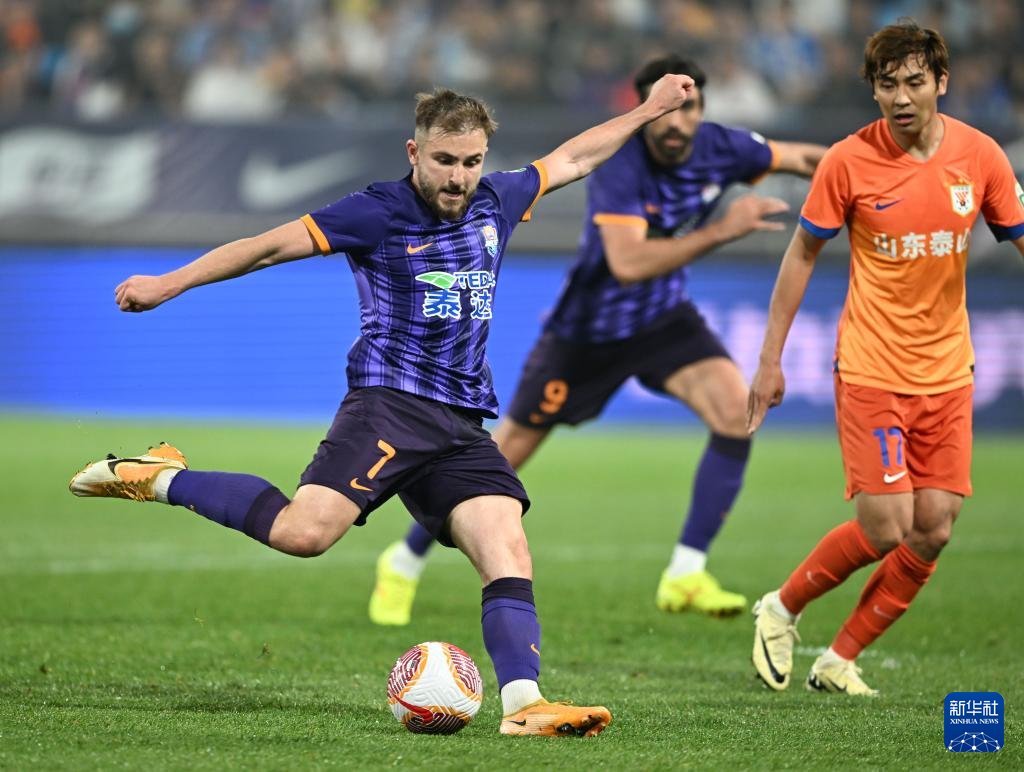 5月21日,天津津门虎队球员阿代米(左)在比赛中射门。新华社记者 赵子硕 摄