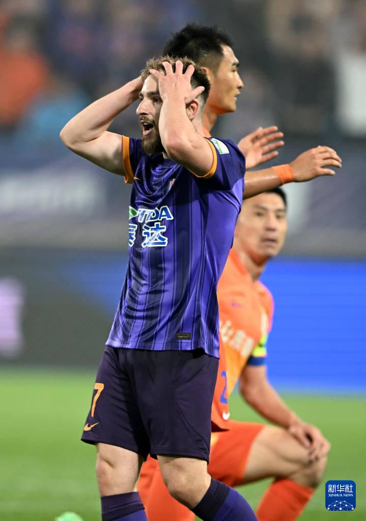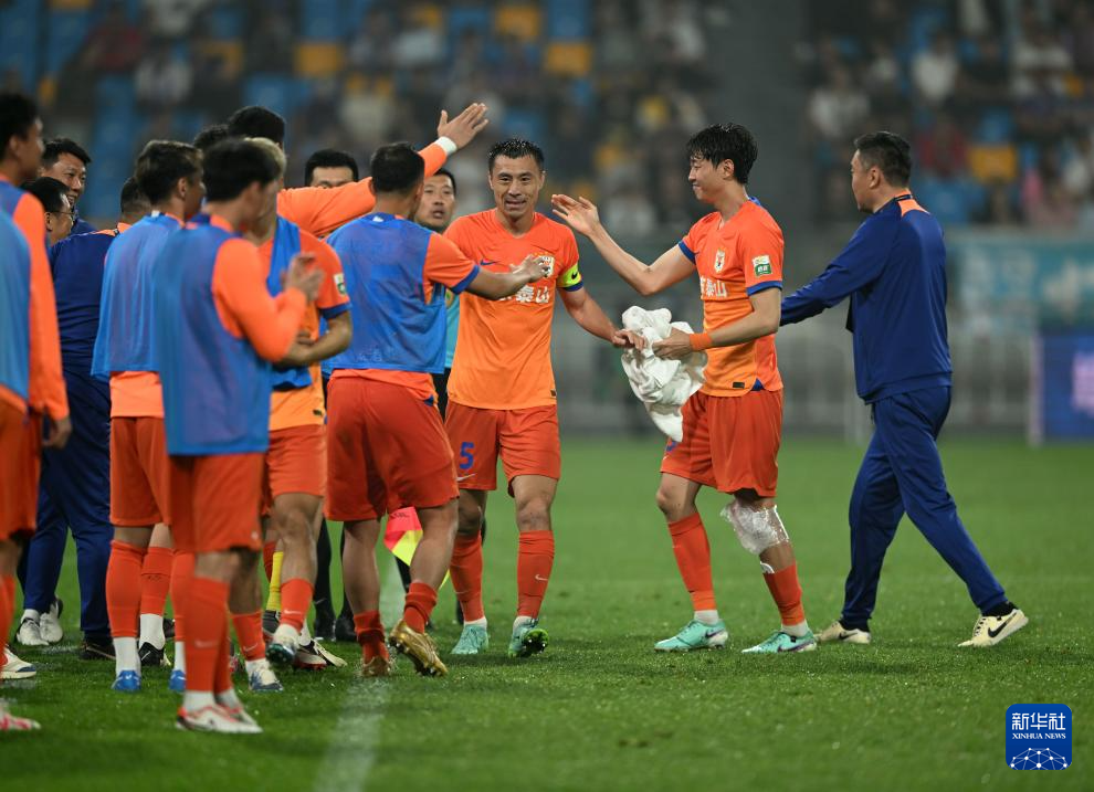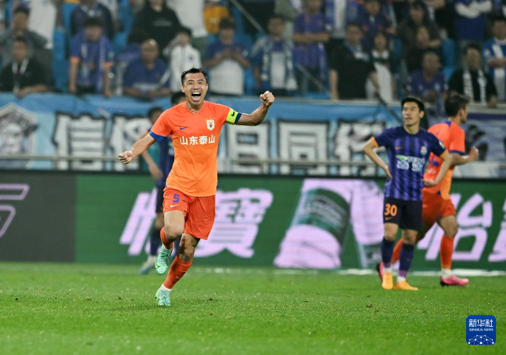 5月21日,山东泰山队球员郑铮在队友进球后庆祝。新华社记者 赵子硕 摄
