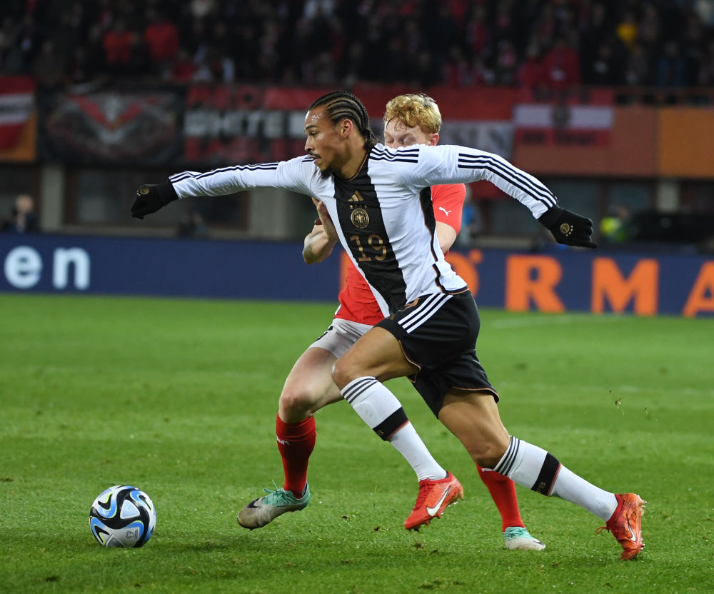 2023年11月21日,德国队球员萨内(前)在一场足球友谊赛中突破。新华社记者 贺灿铃 摄