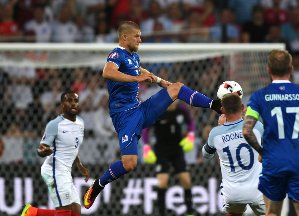 资料图:2016年6月27日,冰岛队球员古德蒙松(上)在2016年欧洲足球锦标赛八分之一决赛中。新华社记者 郭勇 摄