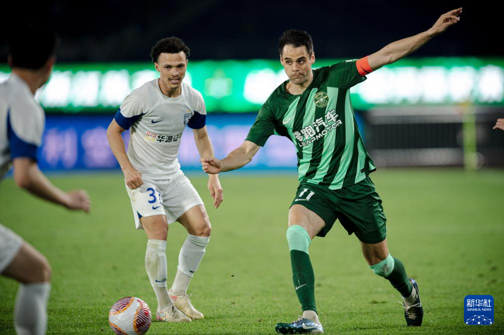 5月21日,浙江队球员莱昂纳多在比赛中射门。新华社记者 江汉 摄