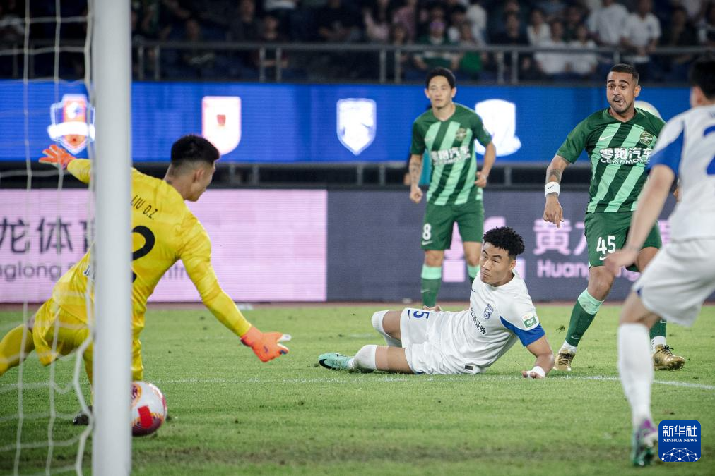5月21日,浙江队球员莱昂纳多(右一)在比赛中射门得分。新华社记者 江汉 摄