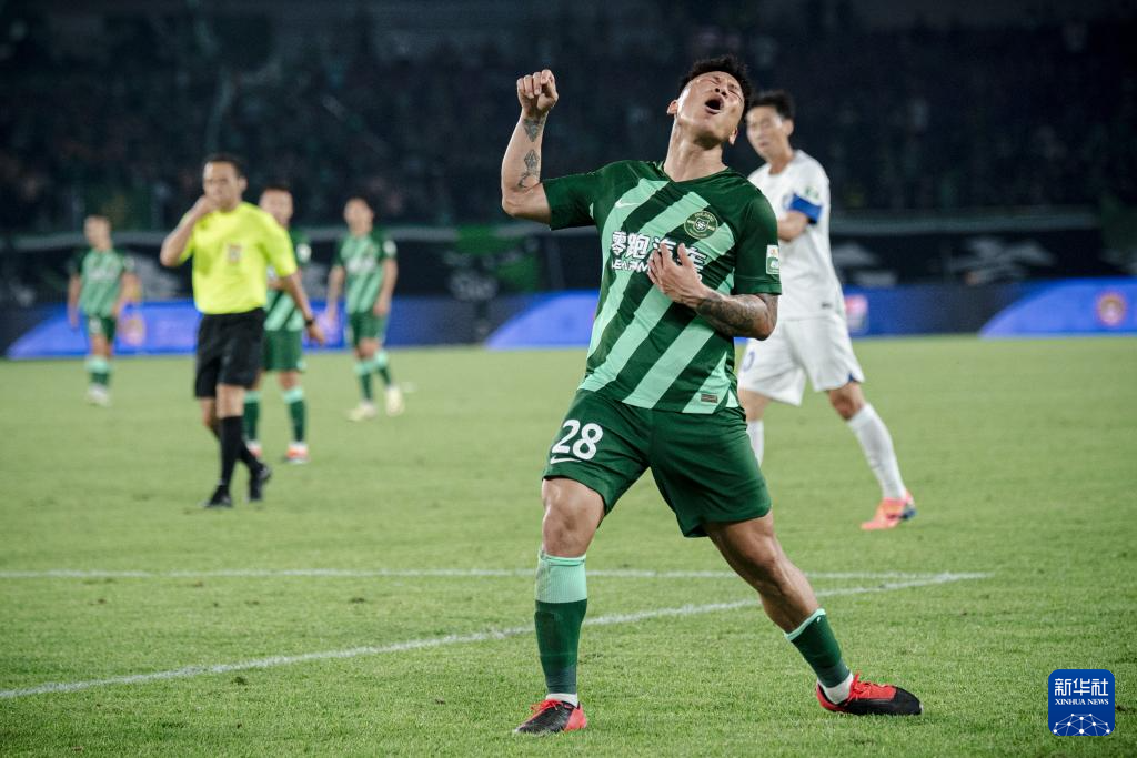 5月21日,浙江队球员莱昂纳多(前)在比赛中庆祝进球。新华社记者 江汉 摄