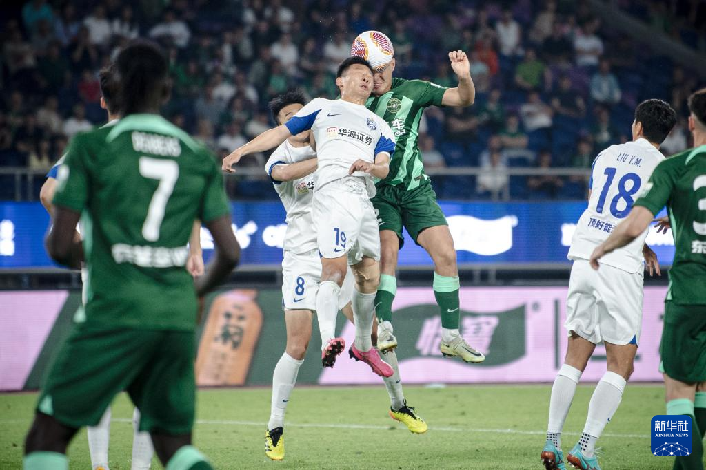 5月21日,浙江队球员梁诺恒(上右)在比赛中与武汉三镇队球员刘越(上中)争顶。新华社记者 江汉 摄