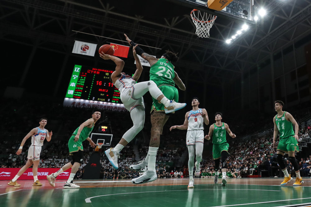 5月20日,新疆队黄荣奇(左)在比赛中进攻。新华社记者 雒圆 摄