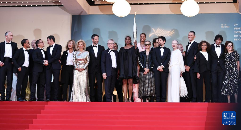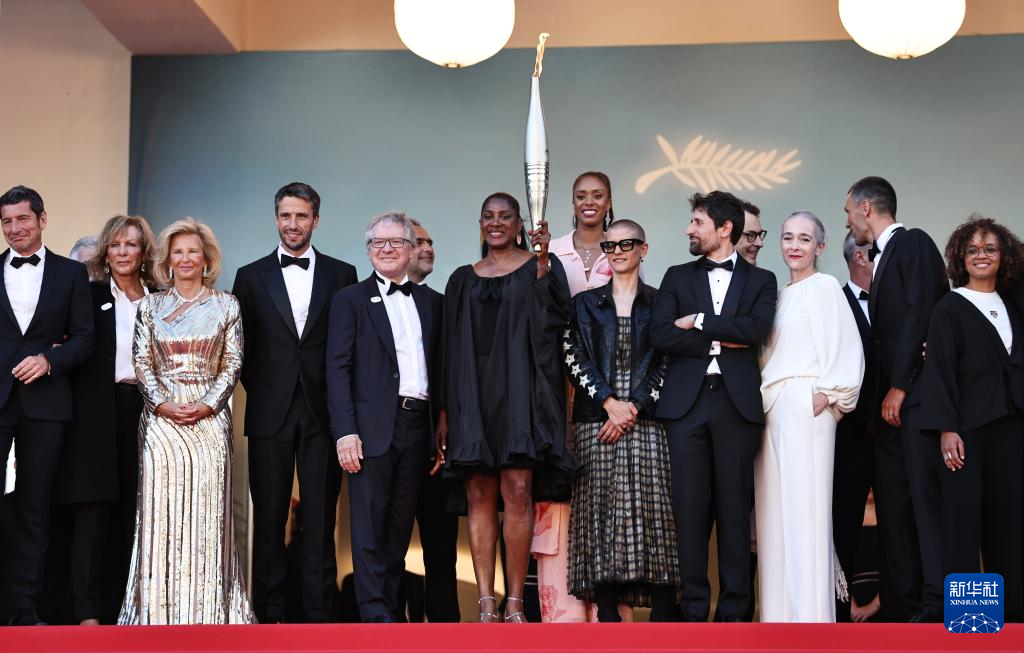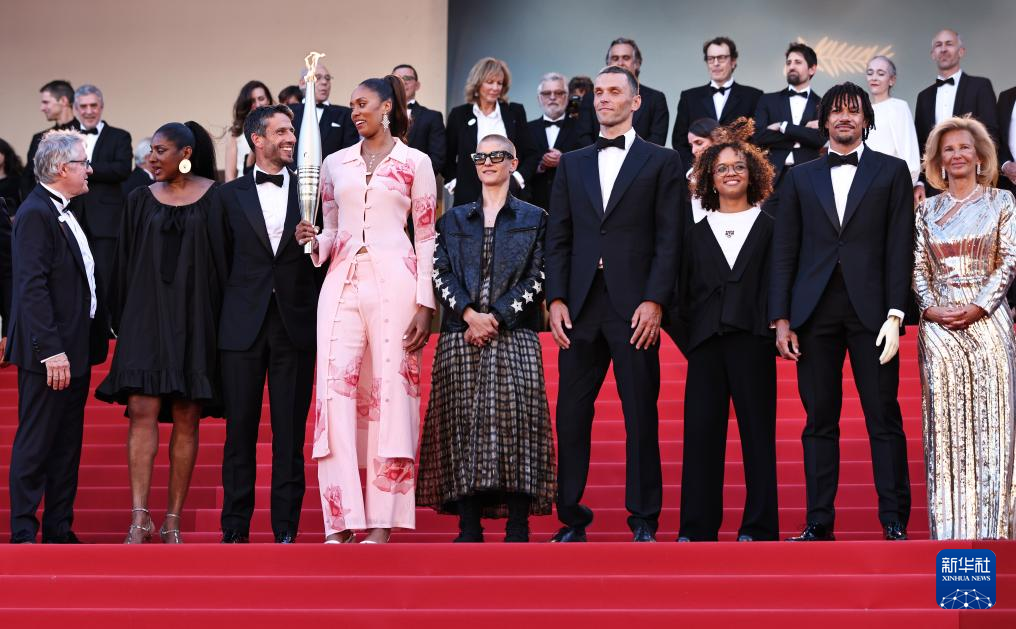 5月21日,在法国南部小城戛纳举行的第77届戛纳国际电影节上,法国篮球运动员伊利亚娜·吕佩尔(左四)手举巴黎奥运会火炬与巴黎奥组委主席埃斯坦盖(左三)等在红毯亮相。新华社记者 高静 摄