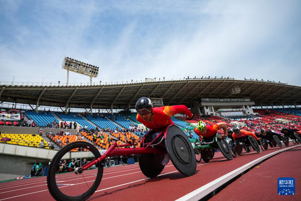 5月22日,中国选手金华(前)在男子1500米T54级别决赛中,最终他以2分54秒85的成绩获得冠军。新华社记者 张笑宇 摄