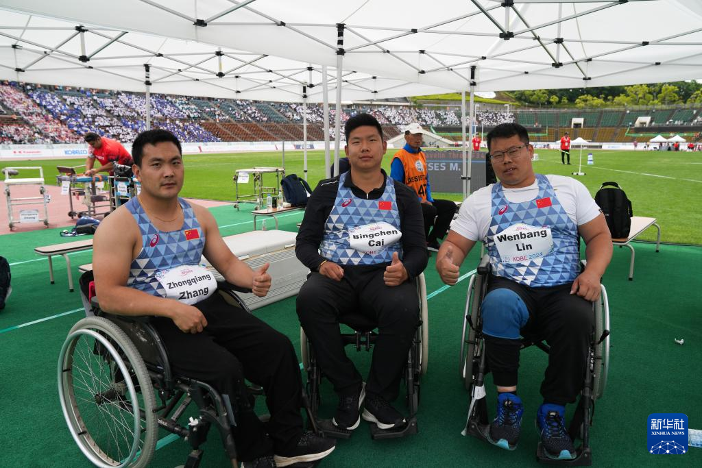 5月22日,中国选手张中强、蔡秉辰和林文榜(从左至右)在男子标枪F34级别决赛中合影,最终他们分别以33米12、26米42和33米82的成绩位列第六、第九和第五。新华社记者 张笑宇 摄