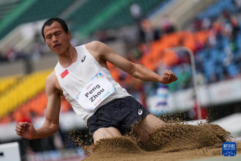 5月22日,中国选手周鹏在男子跳远T38级别决赛中,最终他以6米42的成绩获得季军。新华社记者 张笑宇 摄