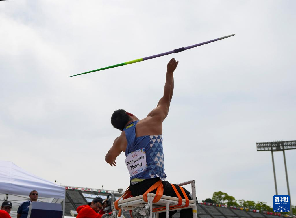 5月22日,中国选手张中强在男子标枪F34级别决赛中,最终他以33米12的成绩位列第六。新华社记者 张笑宇 摄