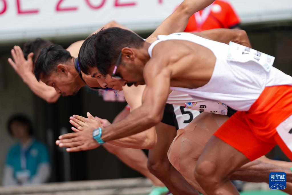 5月22日,中国选手邓培程(右二)在男子100米T36级别预赛中,最终他以12秒00的成绩晋级决赛。新华社记者 张笑宇 摄