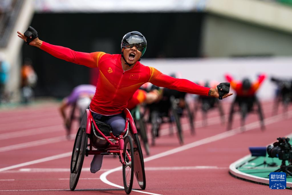 5月22日,中国选手金华在男子1500米T54级别决赛后庆祝,他以2分54秒85的成绩获得冠军。新华社记者 张笑宇 摄