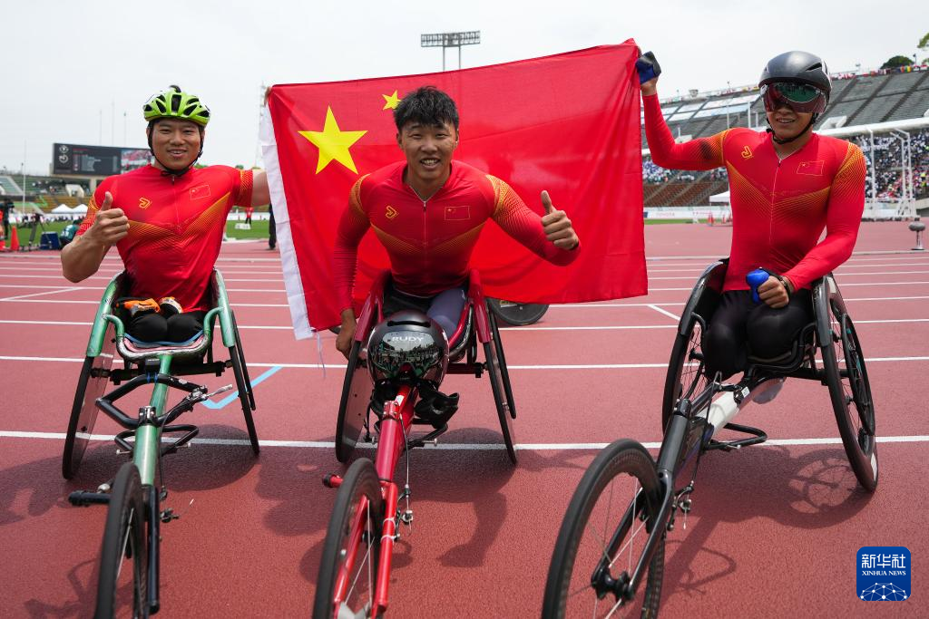 5月22日,中国选手代云强、金华和罗兴传(从左至右)在男子1500米T54级别决赛后合影,最终他们分别以2分56秒41、2分54秒85和2分58秒83的成绩获得亚军、冠军和第八名。新华社记者 张笑宇 摄