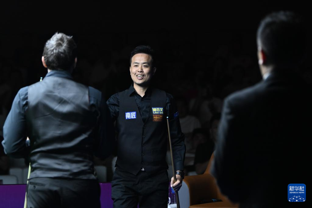 5月22日,傅家俊(中)与奥沙利文(左)在比赛后相互致意。新华社发(王须中摄)