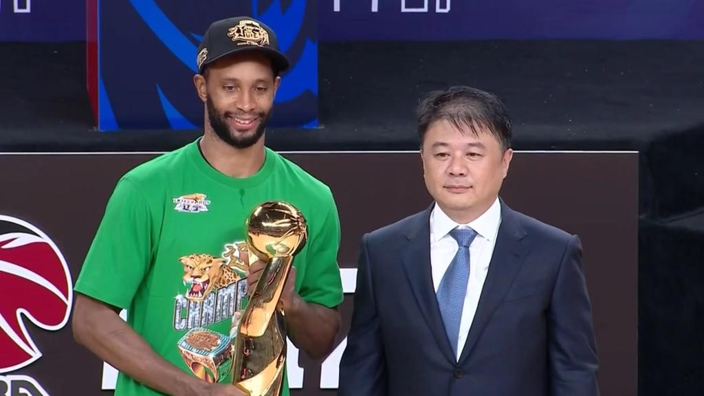 辽宁省体育局副局长曹阳(右)与辽宁队球员弗格在颁奖仪式上