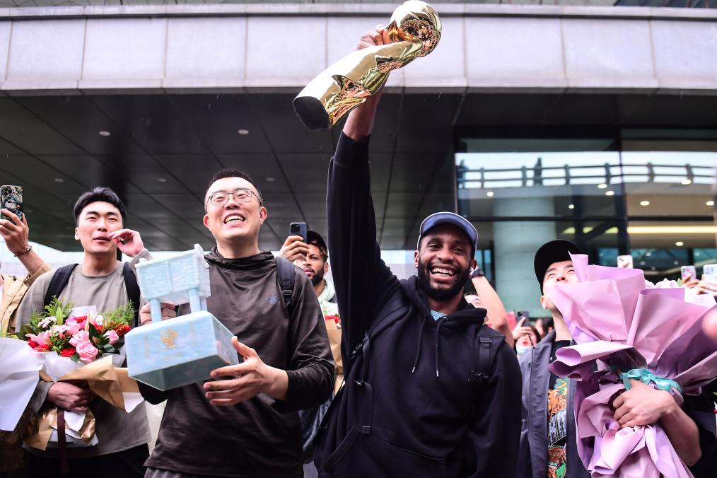 5月23日,辽宁队球员弗格(右二)和队友韩德君(左二)向球迷展示总决赛最有价值球员(FMVP)奖杯和冠军鼎。新华社发