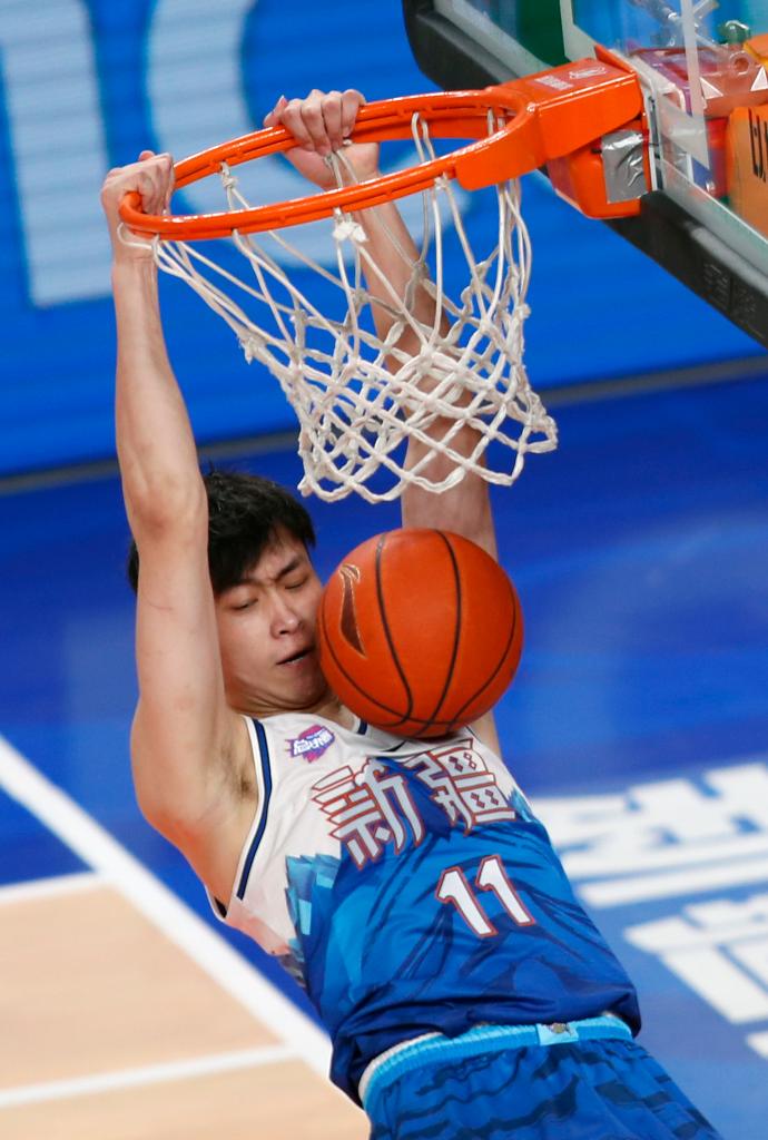 5月22日,新疆队球员齐麟在总决赛第四场比赛中扣篮。新华社记者 雒圆 摄