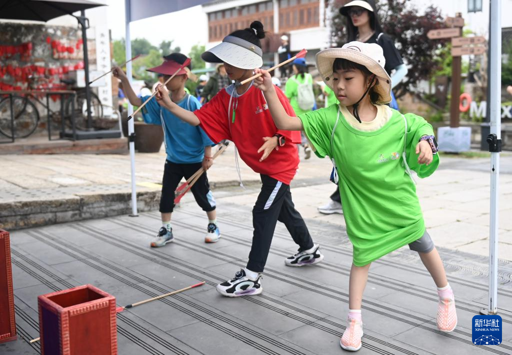 5月25日,参加定向赛的小朋友在比赛中完成投壶体验活动。新华社记者 黄宗治 摄