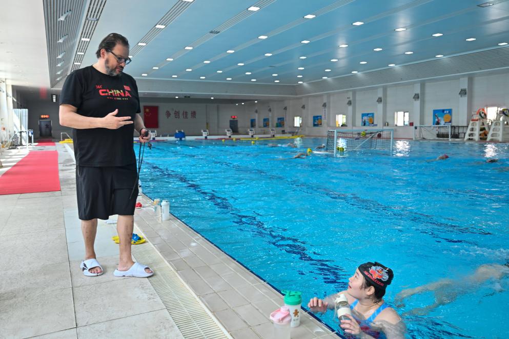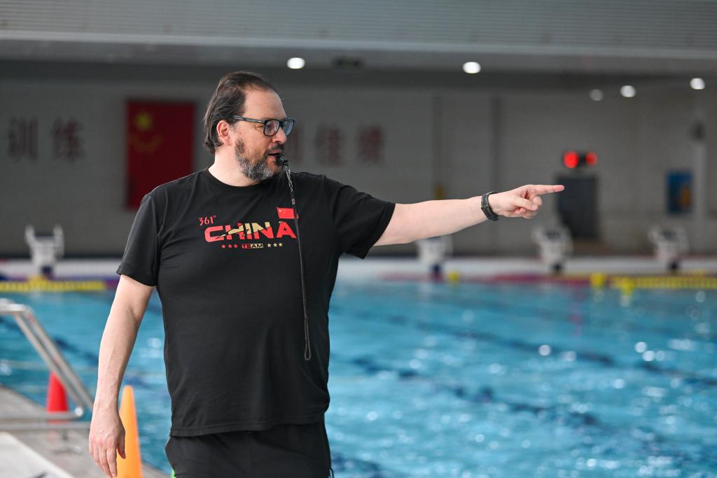 塞奥哈里斯(中)在泳池边指导球队进行训练。新华社记者 孙凡越 摄