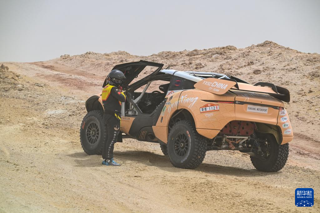 5月25日,陕西云翔汽摩运动有限公司车手张明在比赛中遇到车辆故障下车检查车况。新华社记者 陈朔 摄