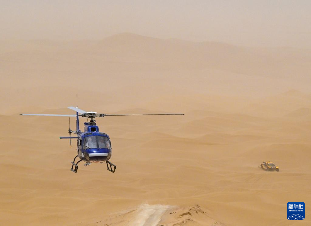 5月25日,昆明可登集团雄鹰赛车队车手宋昆、领航员郭军驾驶赛车在比赛中,空中飞过医疗救援直升飞机。新华社记者 陈朔 摄