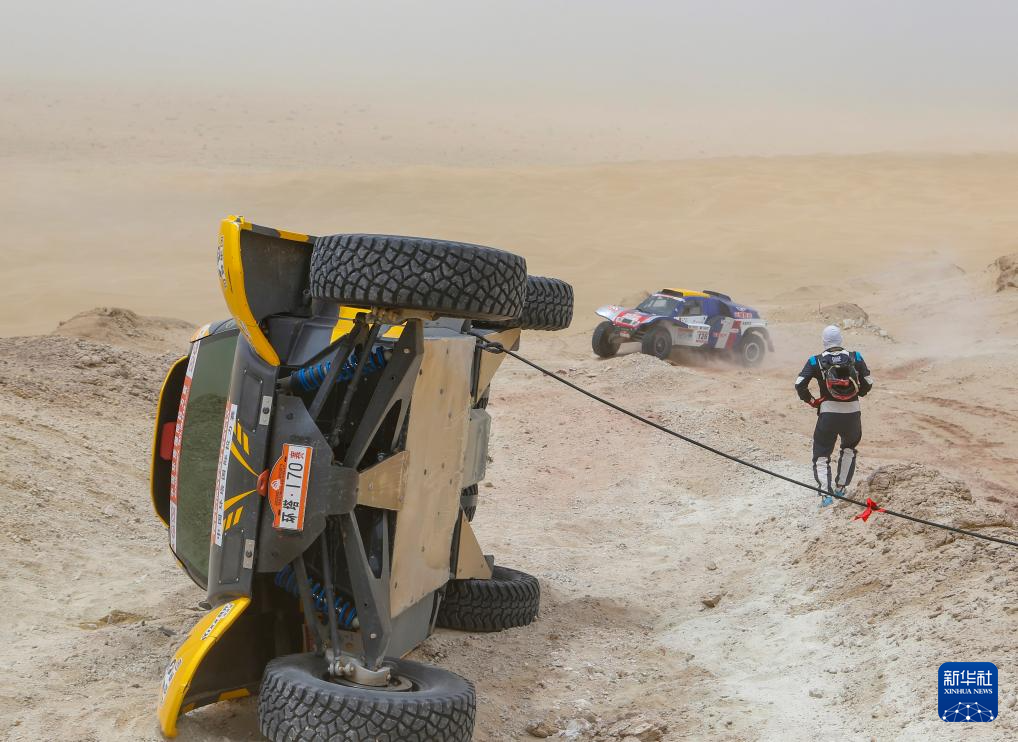 5月25日,昆明可登集团雄鹰赛车队车手宋昆(左)、领航员郭军驾驶赛车在比赛中翻车后捆绑拖车绳。新华社记者 陈朔 摄
