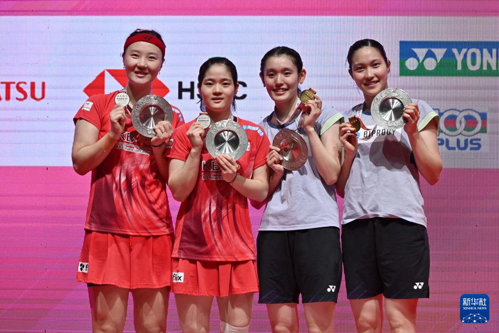 5月26日,岩永铃(右二)/中西贵映(右一)和李幽琳(左二)/申昇瓒在颁奖仪式上合影。新华社发(张纹综摄)