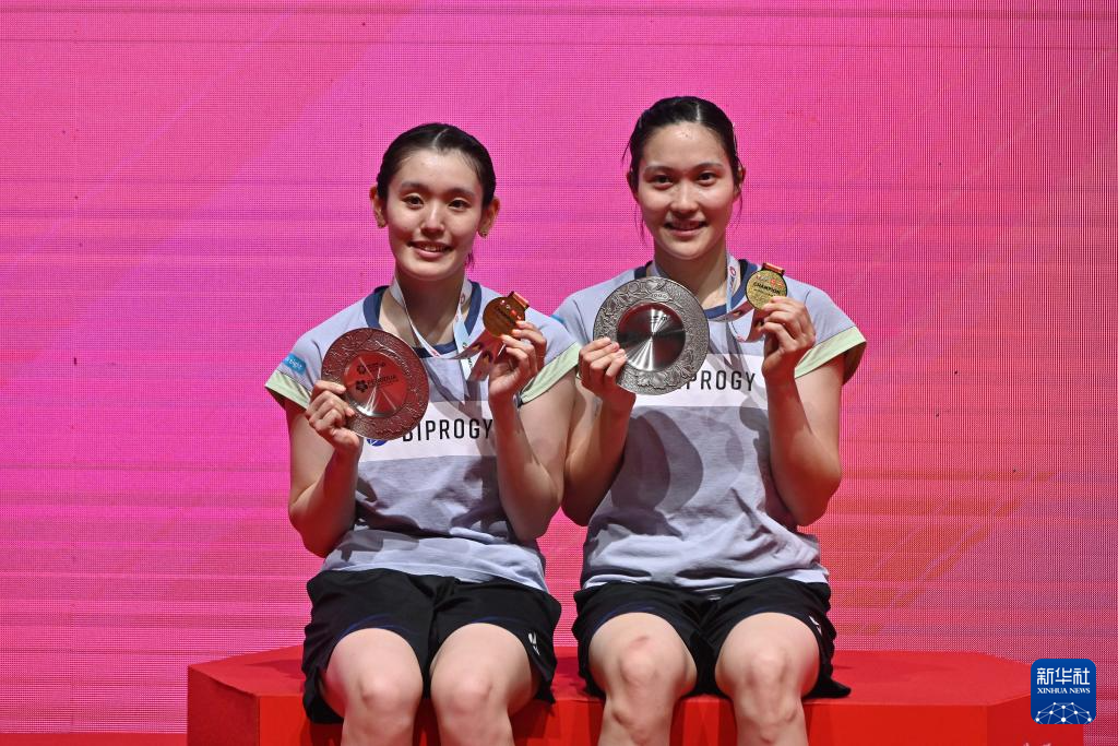 5月26日,岩永铃(左)/中西贵映在颁奖仪式上展示奖牌。新华社发(张纹综摄)