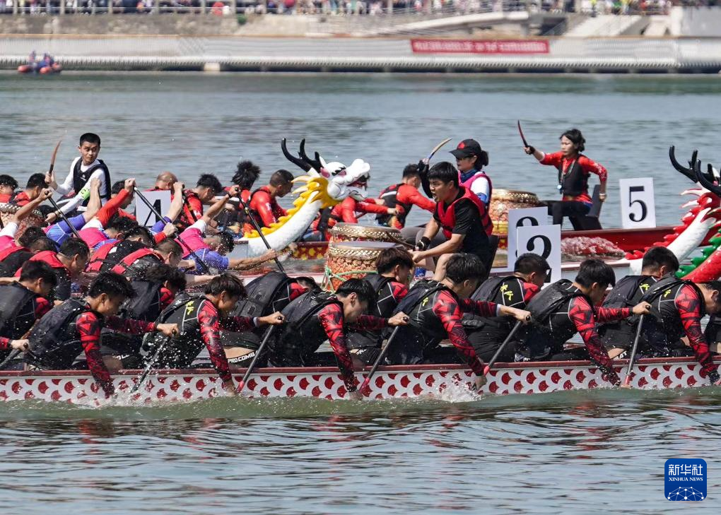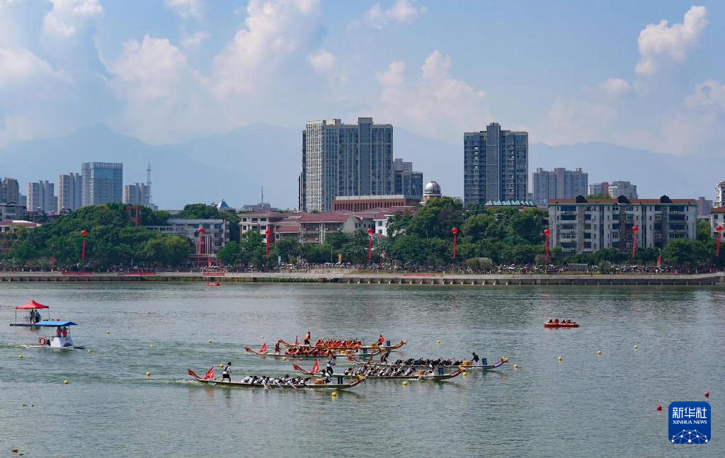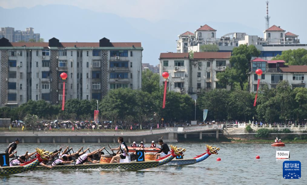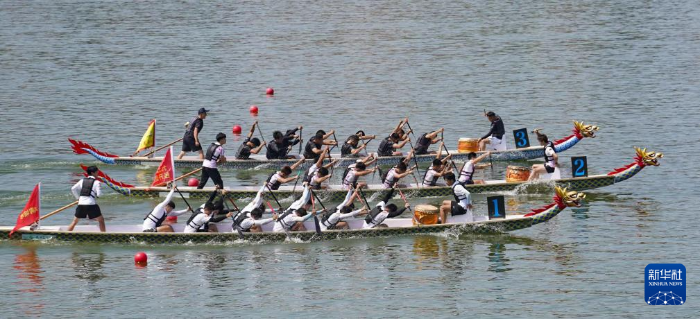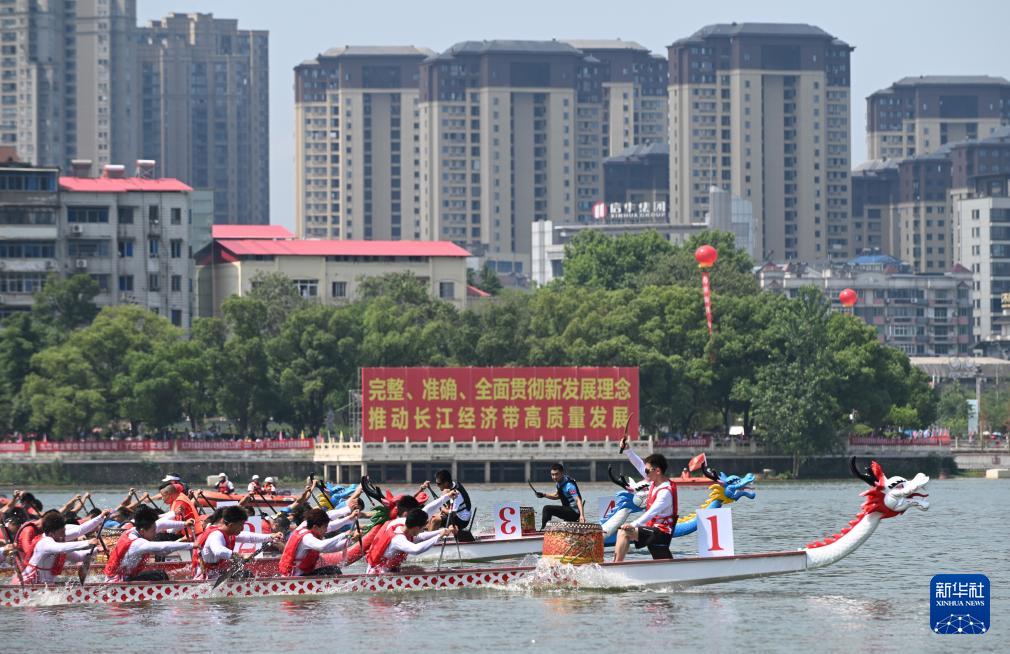 5月25日,参赛队伍在“庐山杯”长江经济带龙舟邀请赛中竞技。新华社记者 隋尚君 摄